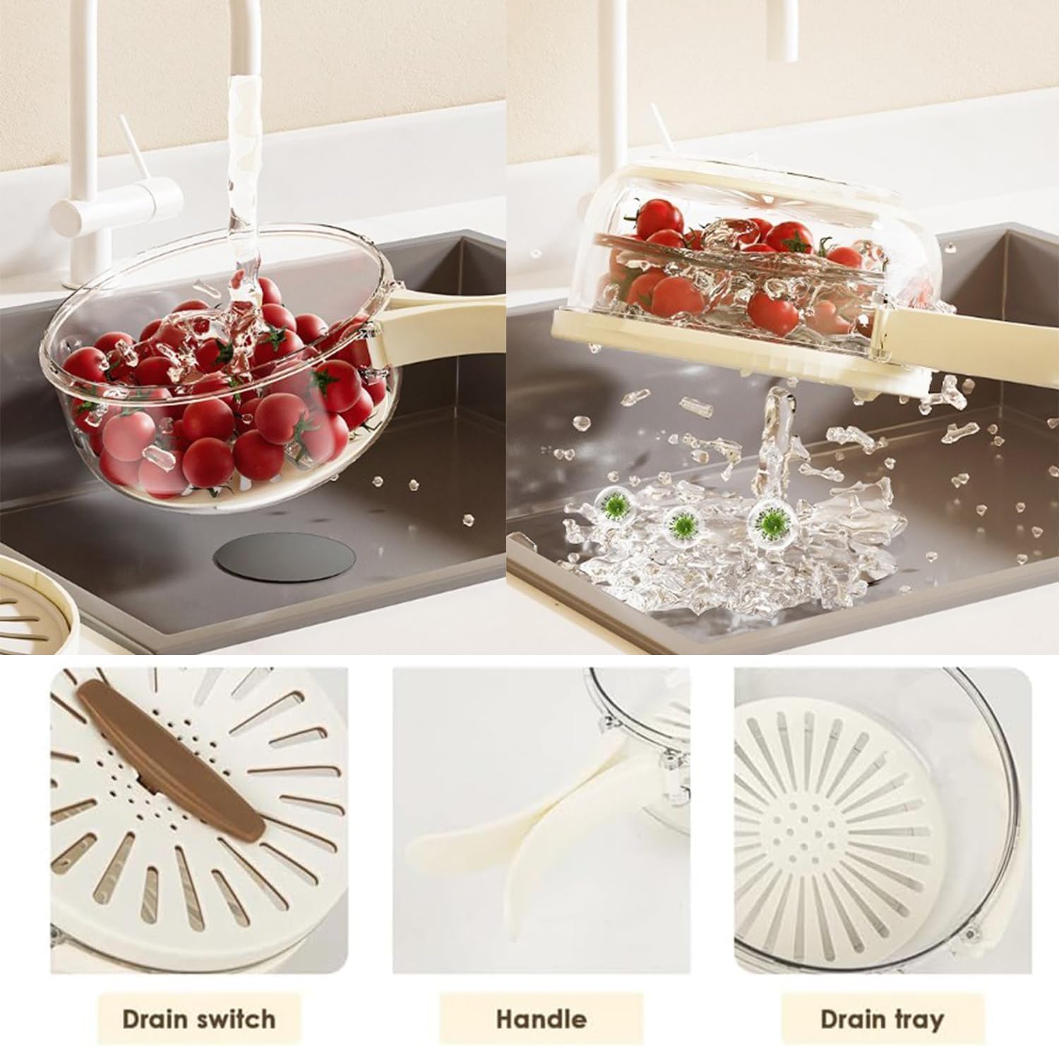 Versiegeln und schütteln, um Obst und Gemüse schnell zu waschen, die Vorbereitungszeit zu verkürzen und die Küche sauber zu halten. Dies gewährleistet eine gründliche Reinigung und hält gleichzeitig das Spritzwasser zurück.