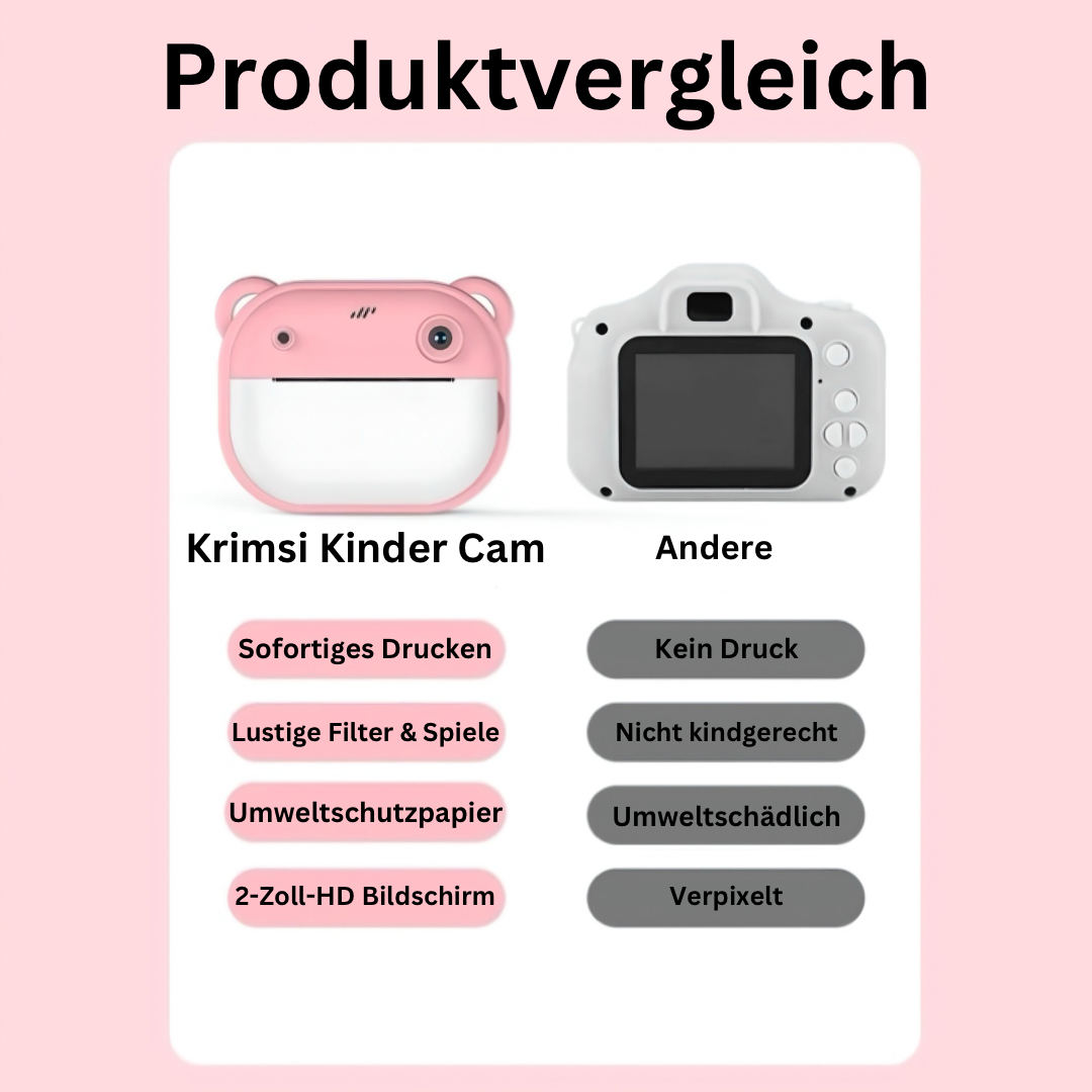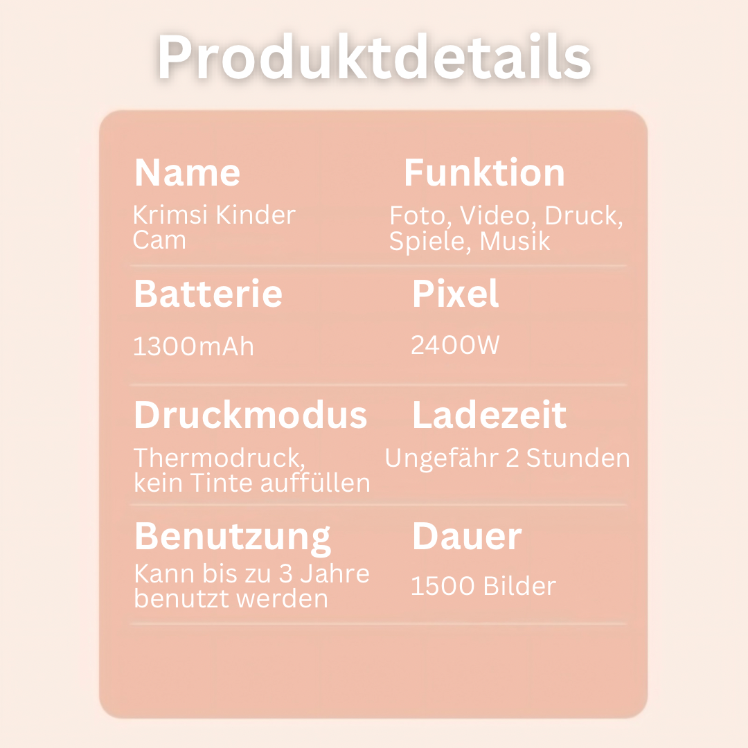 Die Krimsi Kinder Cam ist speziell für Kinder im Alter ab 3 Jahren entwickelt. Dank ihrer kinderfreundlichen Bedienung ist sie perfekt für kleine Hände und neugierige Köpfe.