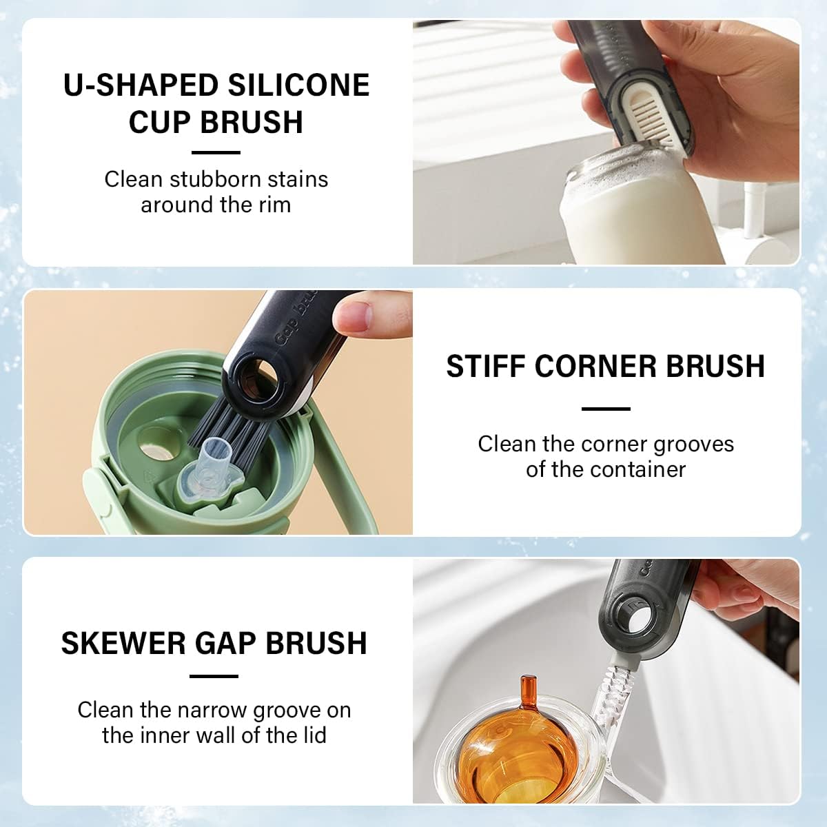 Bewältigen Sie jede Reinigungsherausforderung mit Leichtigkeit. Das 3-in-1-Design umfasst eine U-förmige Bürste, eine winzige Zwischenraumbürste und eine Eckbürste mit steifen Borsten und ist damit perfekt für viele Reinigungsaufgaben geeignet.